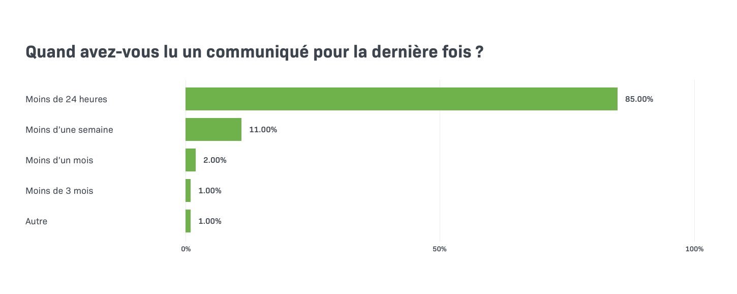 85% des répondants à notre enquête avaient lu un communiqué de presse au court des dernières 24 heures. Plus d'un tiers avaient utilisé un communiqué de presse afin d'écrire un article dans les dernières 24 heures. En comparaison avec l'étude de 2017, l'utilisation des communiqués de presse a augmenté de 8 points. Cela montre une nette augmentation de l'activité des journalistes dans l'utilisation des communiqués de presse.