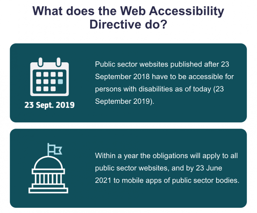 Les lois nationales concernant l'offre de services numériques obligent les opérateurs du secteur pulic et certaines organisations du secteur privé à respecter plusieurs exigences en matière d'accessibilité. Les différentes lois nationales au sein de l'UE exécutent ainsi la European Union Accessibility Directive.
